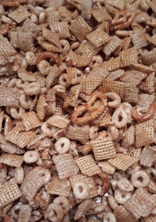 Honey Snack Mix $3.00/2 cups: rice and corn square cereal, honey nut cereal, walnuts, pretzels baked in a honey glaze